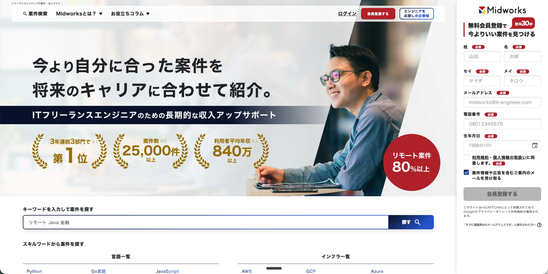 Web系・サーバーサイド中心で月額60万〜90万円レンジ。リモート案件も1万件以上扱っています。