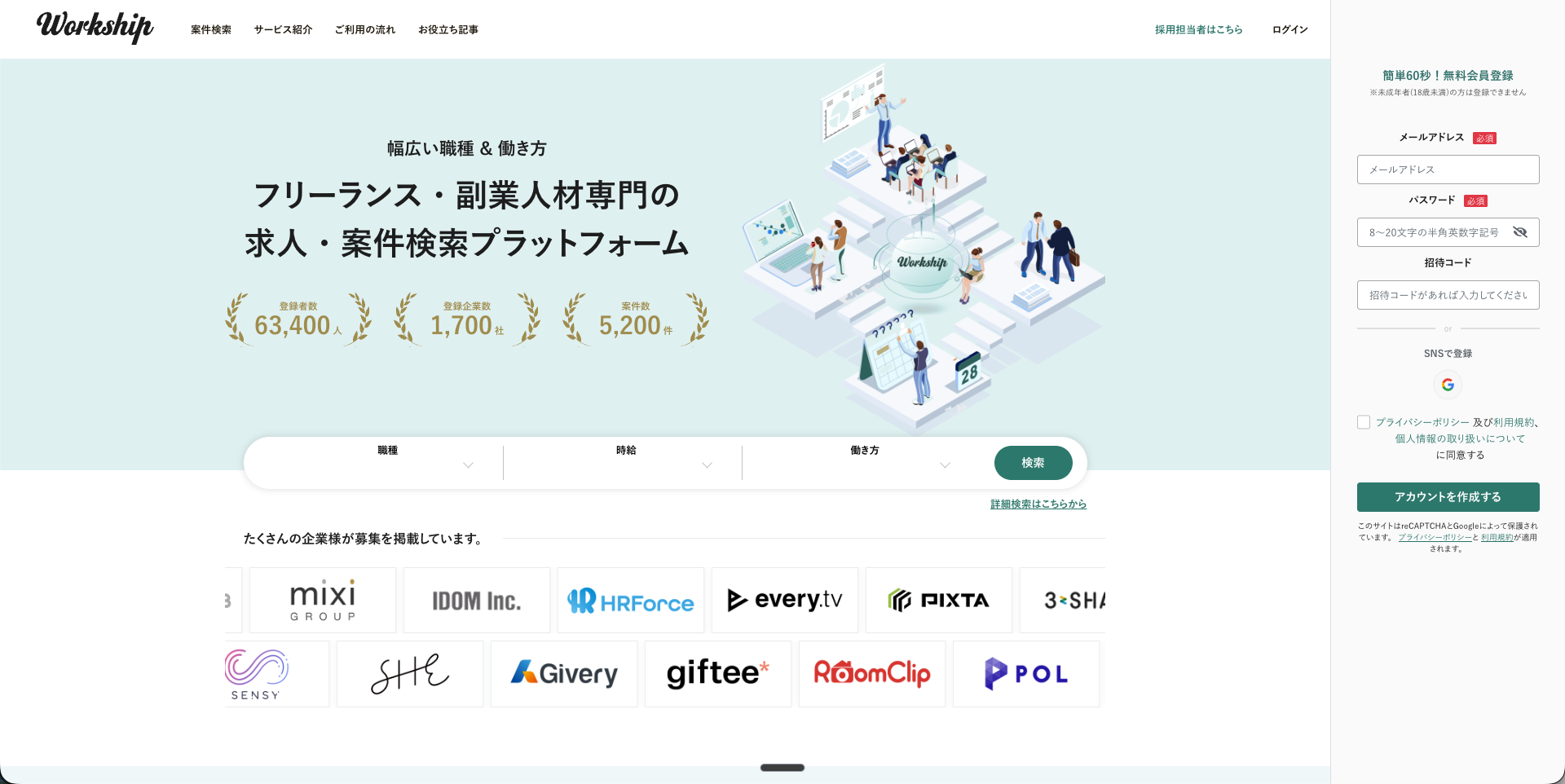 Workshipは、株式会社GIGが運営するフリーランス・副業人材向けのマッチングプラットフォーム。エージェント型とプラットフォーム型のハイブリッドモデルを取っているのが最大の特徴です。