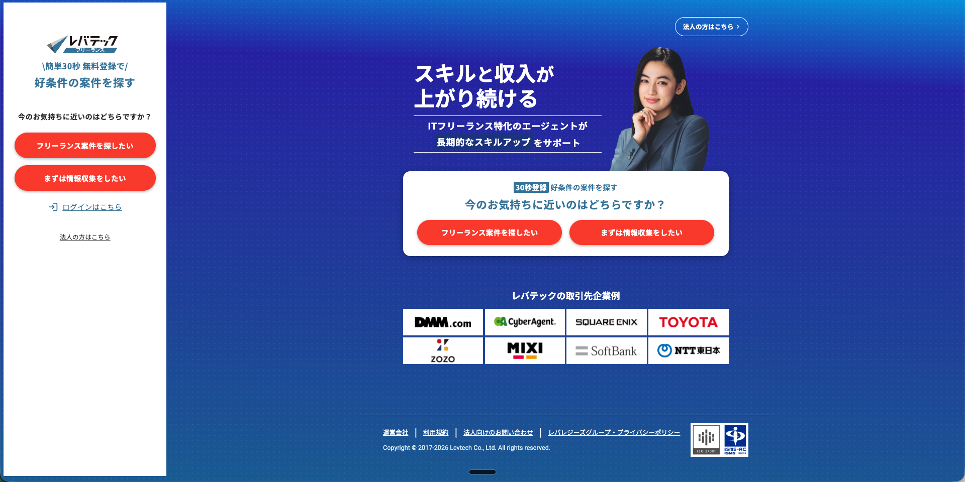 レバテックフリーランスは、レバレジーズ株式会社が運営するIT・Web特化型のエージェント。フリーランスエンジニア向け案件サイトの認知率・登録率で業界No.1を標榜する、いわゆる王道の一社です。