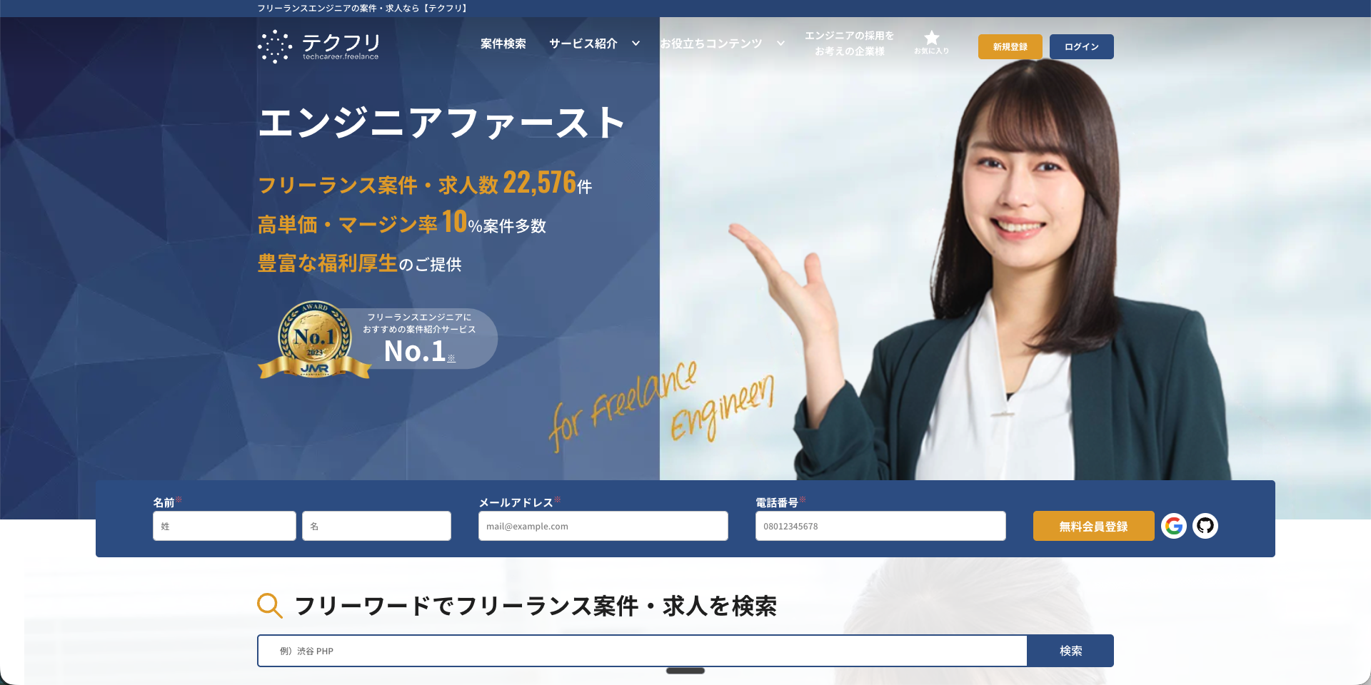 テクフリは、株式会社アイデンティティーが運営するエージェント。多くのエージェントが多重下請け構造を抱える中で、エンド直契約比率の高さを強みにしています。