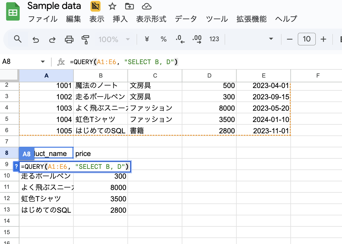 SELECT product_name, price FROM products;QUERY 関数では、商品名 (B列) と価格 (D列) を指定するので、こうなります。
