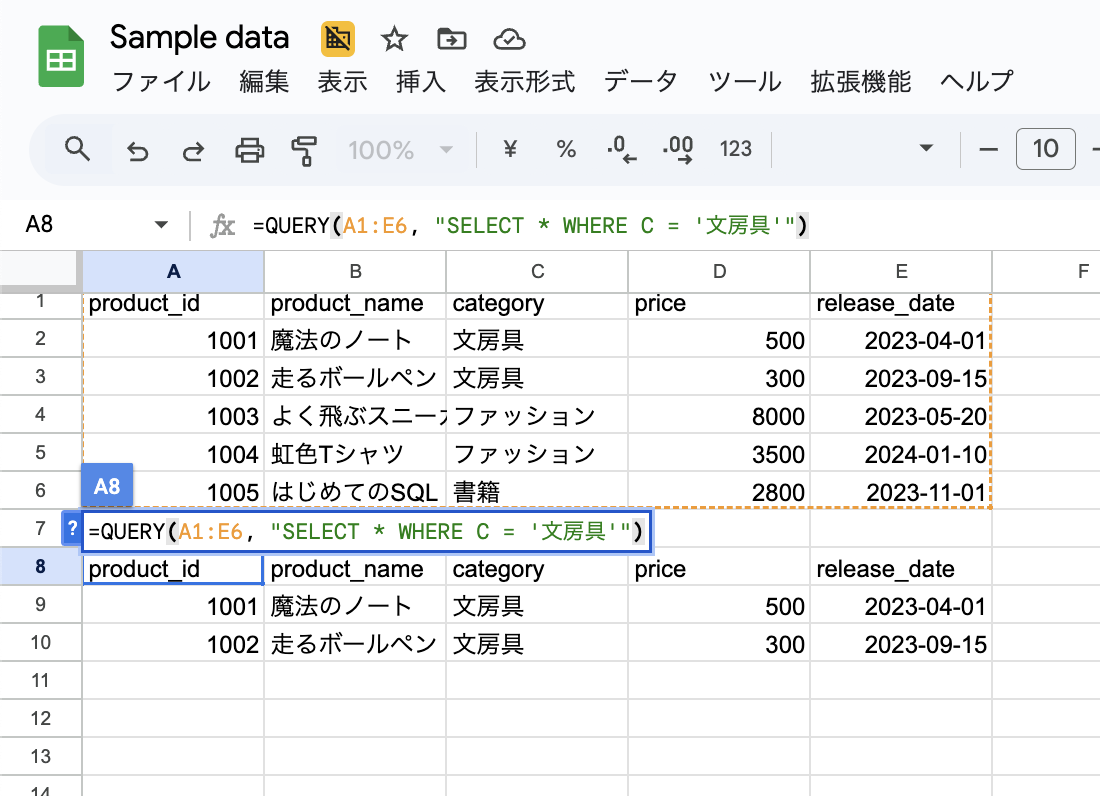 =QUERY(A1:E6, "SELECT * WHERE C = '文房具'")前回と同じように「魔法のノート」と「走るボールペン」の行だけが表示されたはずです。