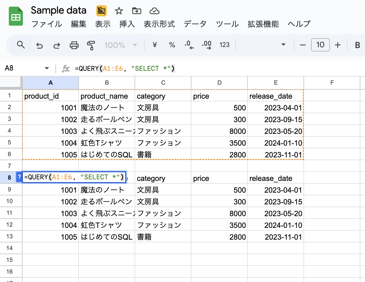 SELECT * FROM products;QUERY 関数では、FROM (どのテーブルから) の部分は、すでに関数の A1:E6 で指定しています。