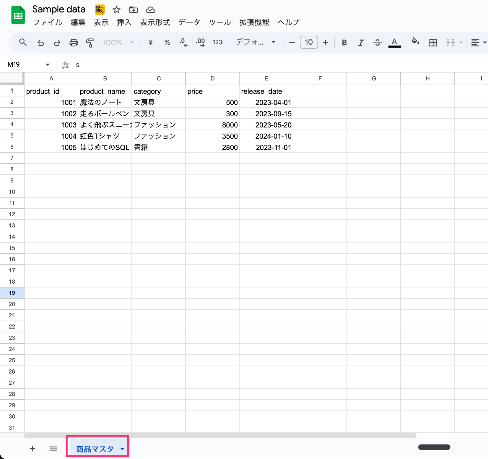 まずは、スプレッドシートの「シート」を2枚に分けて、1枚目のデータを含むシートは名前を「商品マスタ」に変更します。