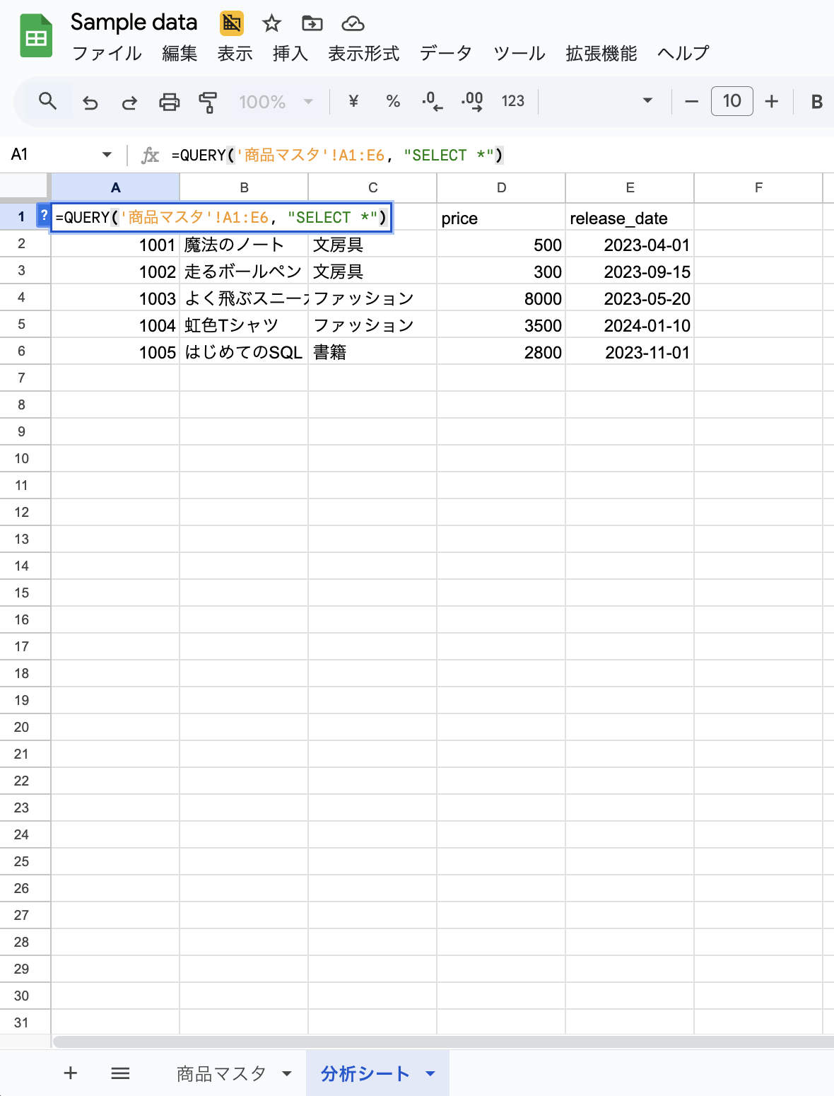 =QUERY('商品マスタ'!A1:E6, "SELECT *")
