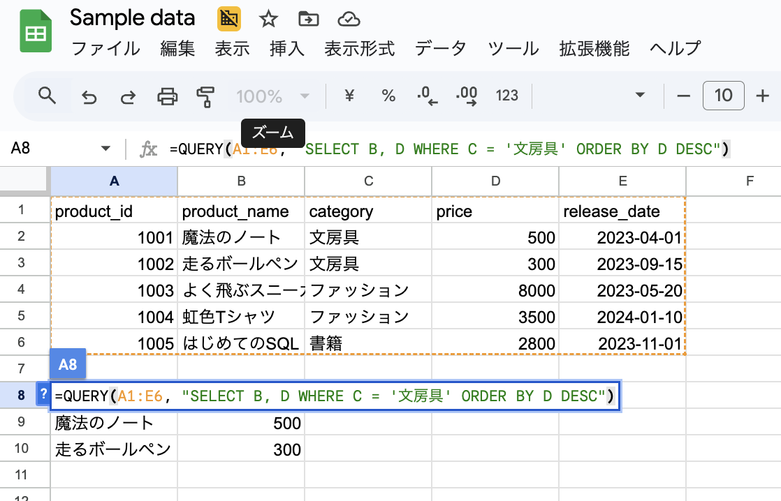=QUERY(A1:E6, "SELECT B, D WHERE C = '文房具' ORDER BY D DESC")これを入力して、次のように表示されれば、完璧です!