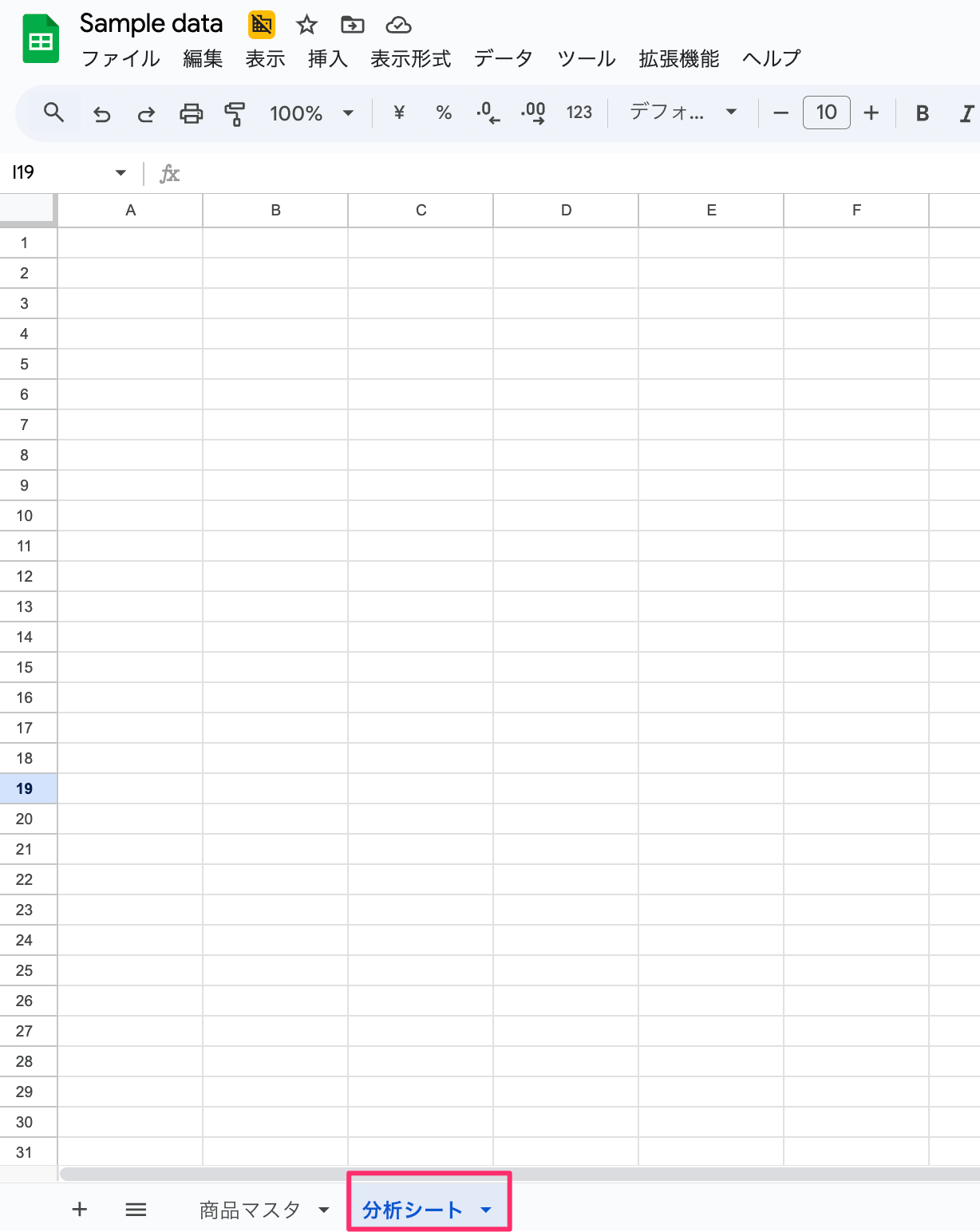 では、「分析シート」にいながら、「商品マスタ」シートのデータを操作するには、どうすればいいのでしょうか?QUERY関数の第1引数(データ範囲)の書き方を、少しだけ変える必要があります。